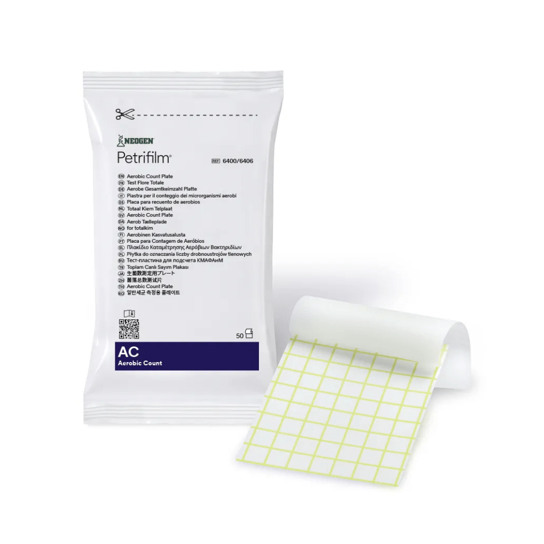 La placa Petrifilm AC proporciona un recuento aeróbico total en tan solo 48 horas. Un colorante indicador rojo en la placa colorea todas las colonias de rojo para un mejor contraste y facilitar el recuento. Las colonias rojas también se distinguen fácilmente de las partículas de alimento opacas que pueden causar confusión al utilizar otros métodos de cultivo. Además, las placas Neogen® Petrifilm para recuento aeróbico pueden utilizarse para enumerar bacterias ácido lácticas en alimentos, tanto aeróbicas como anaeróbicas.