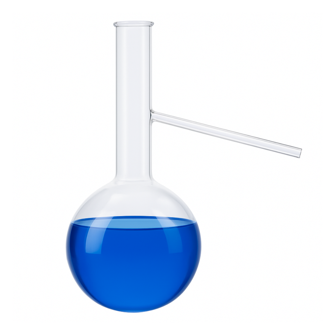 Fabricado en vidrio borosilicato 3.3. Con base redondeada boca tipo vial y brazo lateral a un ángulo de 75º, utilizado como material de vidrio de laboratorio para la industria química o bioquímica.