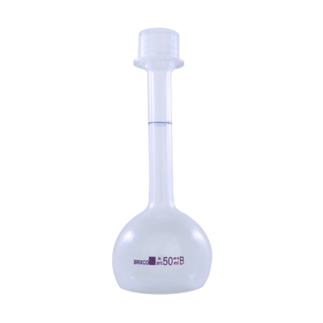 Balón volumétrico en polipropileno, casi transparente, con tapa rosca plástica. Presentación por paquete.