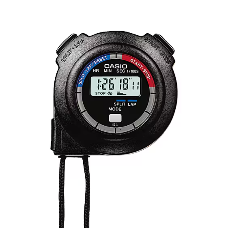 CRONÓMETRO de 1/100 seg. Este modelo está configurado para adaptarse cómodamente a la palma de la mano e incluye una correa para el cuello. Las funciones de cronómetro incluyen un máximo de 10 horas, temporización de 1/100 segundos, tiempo de vuelta y fracciones de tiempo.