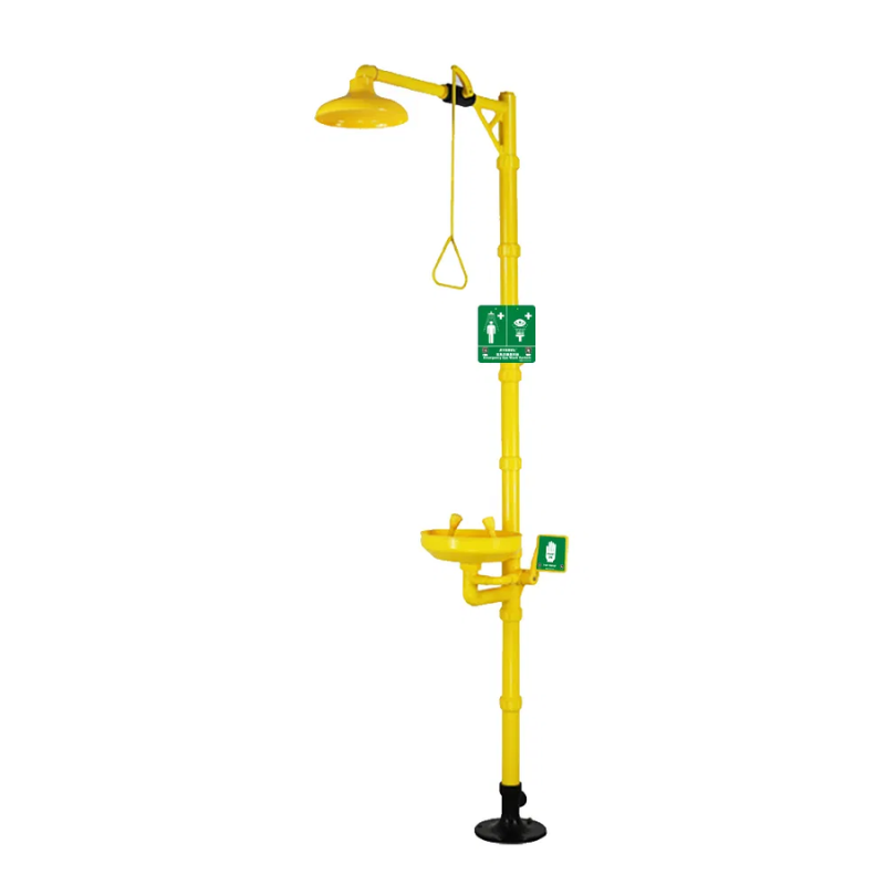 Ducha combinada con enjuague ocular con salidas de rociado con doble aspersión, tapas anti-polvo y tazón de polipropileno. Esta combinación de lavaojos y ducha está fabricada completamente en ABS (excepto las válvulas), que resiste la corrosión y es ecológico y duradero, activado por una barra de tracción superior tipo campana de alta visibilidad y pedal inferior. Fabricadas según ANSI Z358.1-2014.