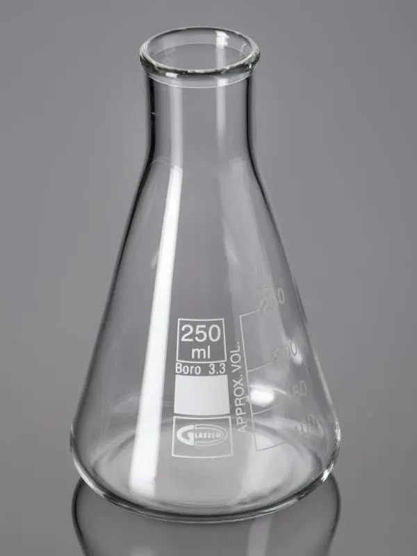 ASTM E-438 Tipo 1, vidrio Borosilicato 3.3, ISO 1773 paredes gruesas y graduaciones laterales. Útil para realizar mezclas por agitación y para la evaporación controlada de líquidos., impresión blanca.