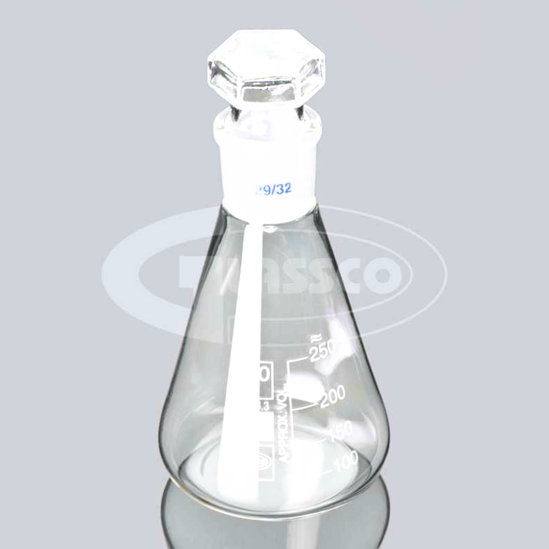 Erlenmeyer fabricado en vidrio borosilicato 3.3, DIN ISO 3585 - ISO4797 con tapón semicilíndrico esmerilado 29/32, boca estrecha y escala graduada.