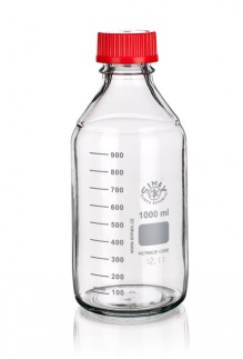 Características Frasco graduado con tapa a rosca roja, vidrio claro