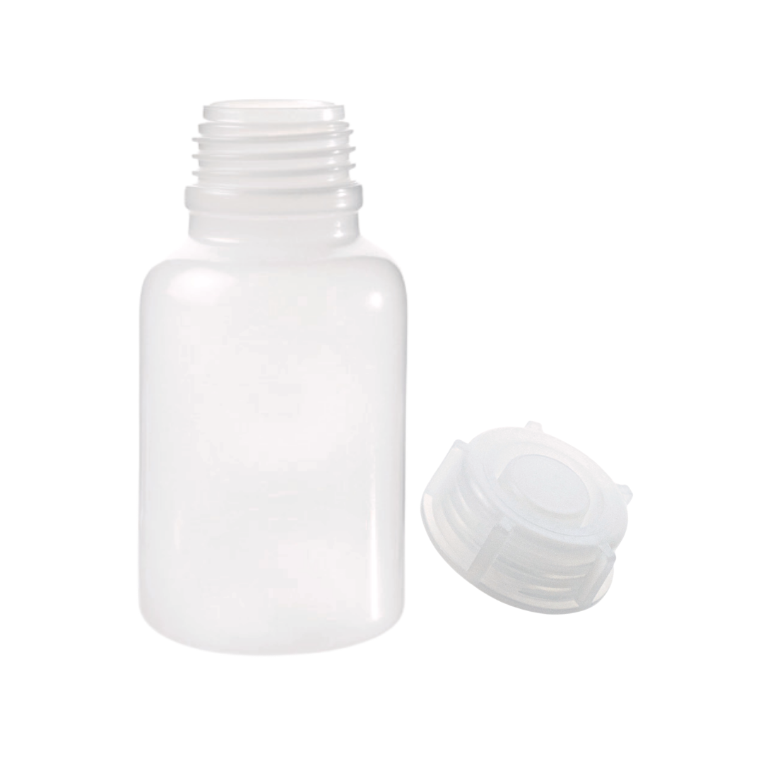 Botella, Polietileno de baja densidad, cuello ancho. Flexible, translúcido. Con cierre de rosca.