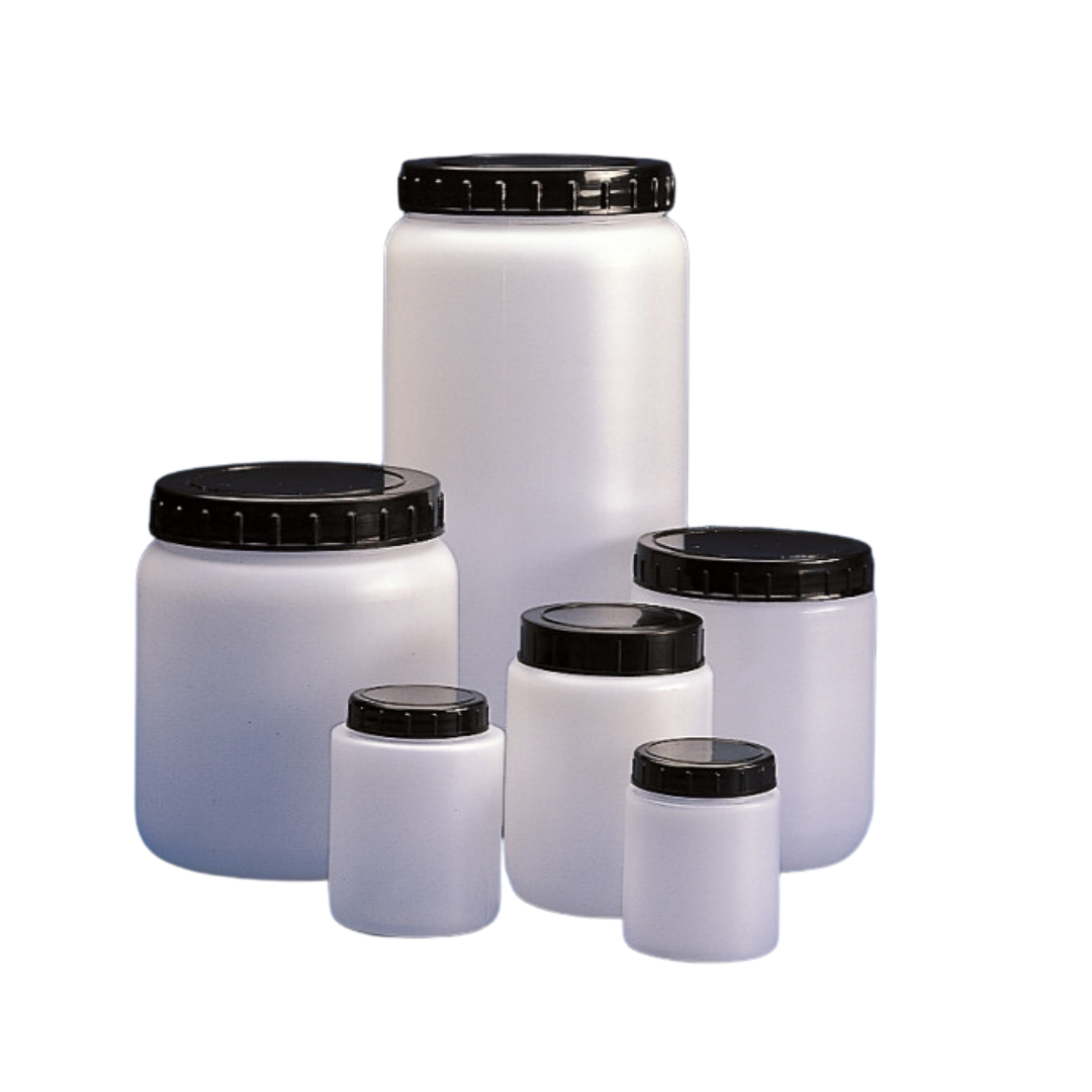 Frasco plástico en PE, contratapa en PE y tapa en PP. Cuello Ancho con tapa rosca y contratapa. Ideales para polvos y muestras sólidas.