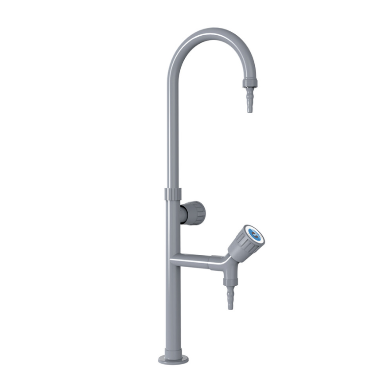 Este grifo de laboratorio de doble salida, con posiciones alta y baja, se instala sobre el fregadero y se utiliza habitualmente para suministrar agua a instrumentos de laboratorio, limpiar tubos de ensayo y material de vidrio, etc. El producto está diseñado con dos válvulas controladas independientemente y dos salidas de agua.