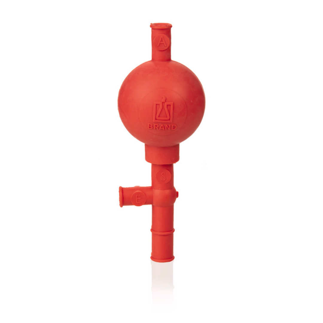 Pera de goma, caucho natural, modelo universal, pipetas hasta 100 ml. Auxiliares de pipeteado para pipetas aforadas y pipetas graduadas. Control de las funciones mediante presión sobre la válvula correspondiente con los dedos pulgar e índice. Modelo universal, pipetas hasta 100 ml. Pera de goma con 3 válvulas. Válvula A: expulsión de aire. Válvula S: aspiración de líquido. Válvula E: vaciado de líquido.