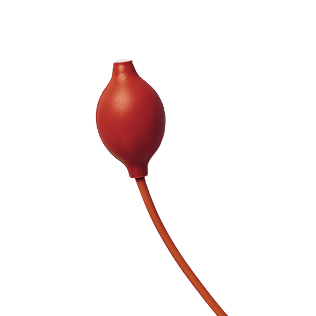 Fuelle de goma para aparato de valoración, buretas de cero automático, color naranja, con válvula y manguera de conexión.