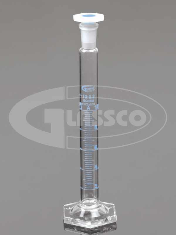 DIN EN ISO 4788, tapón PE, boca esmerilada, vidrio BORO3.3, base hexagonal, con certificado de trabajo individual, impresión azul.