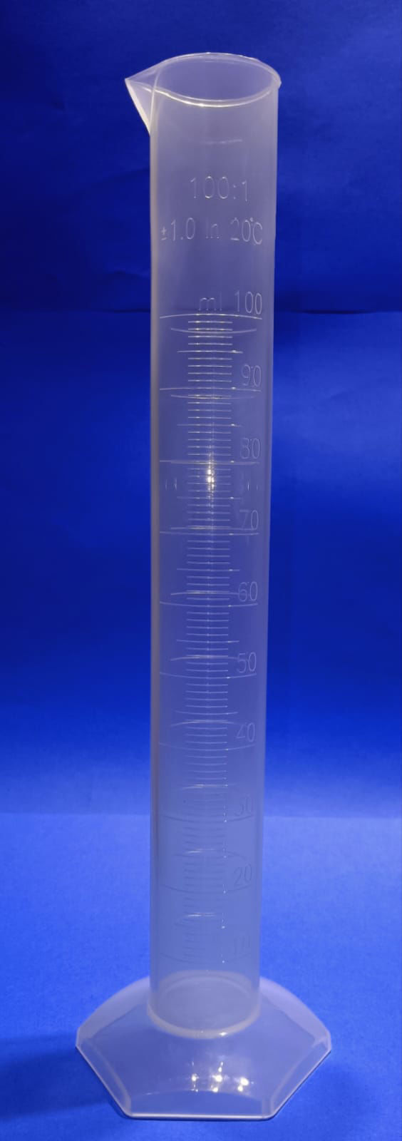 Altamente transparente, graduada en alto relieve, base hexagonal, en polietileno.