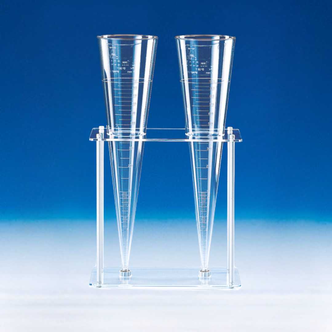 Soporte para conos de sedimentación en plástico PMMA/PP, para dos conos de sedimentación en plástico. Diseño compacto y fácil de transportar, incluso con conos llenos.