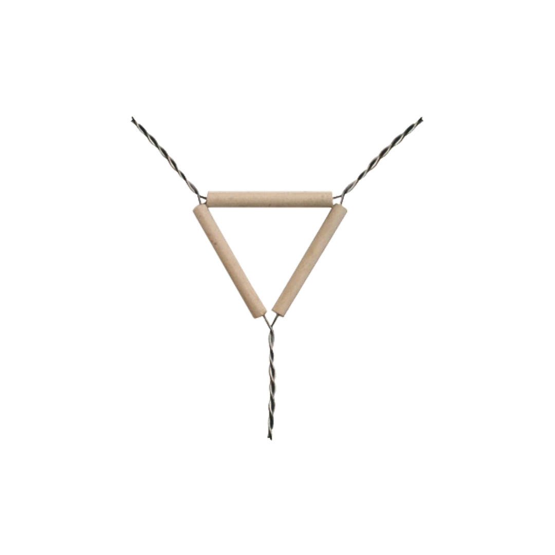 Triángulo de porcelana, glaseado, puntas en alambre galvanizado, dimensiones 60 mm. Presentación por 4 unidades. Disponible hasta agotar existencias.