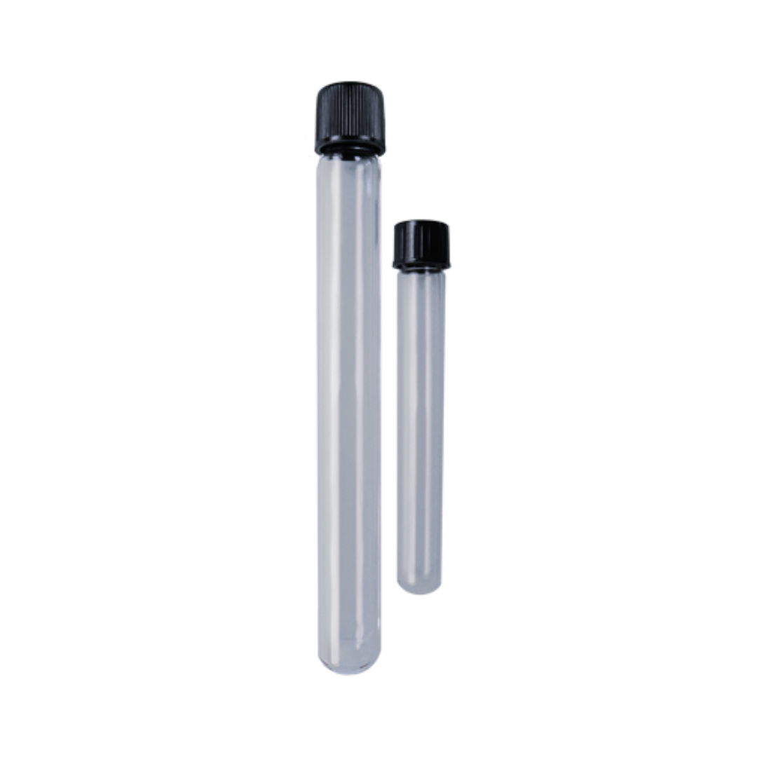 Tubo de ensayo en vidrio flameable borosilicato 3.3 o neutro, con tapa rosca. Presentación por paquete.